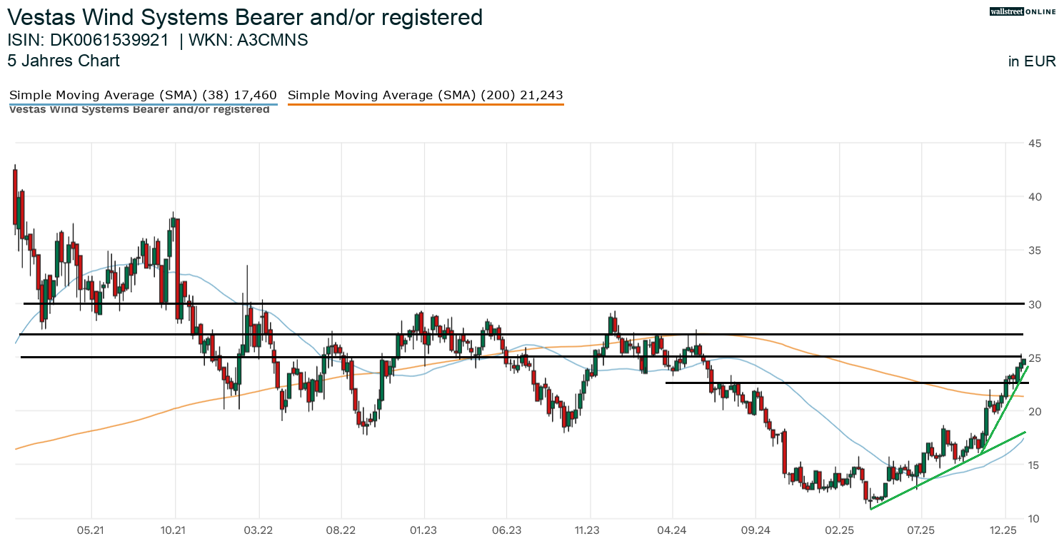 Tage-Linie bullisch. Sollte es Vestas nun auch noch gelingen, die 25er Widerstandsmarke zu