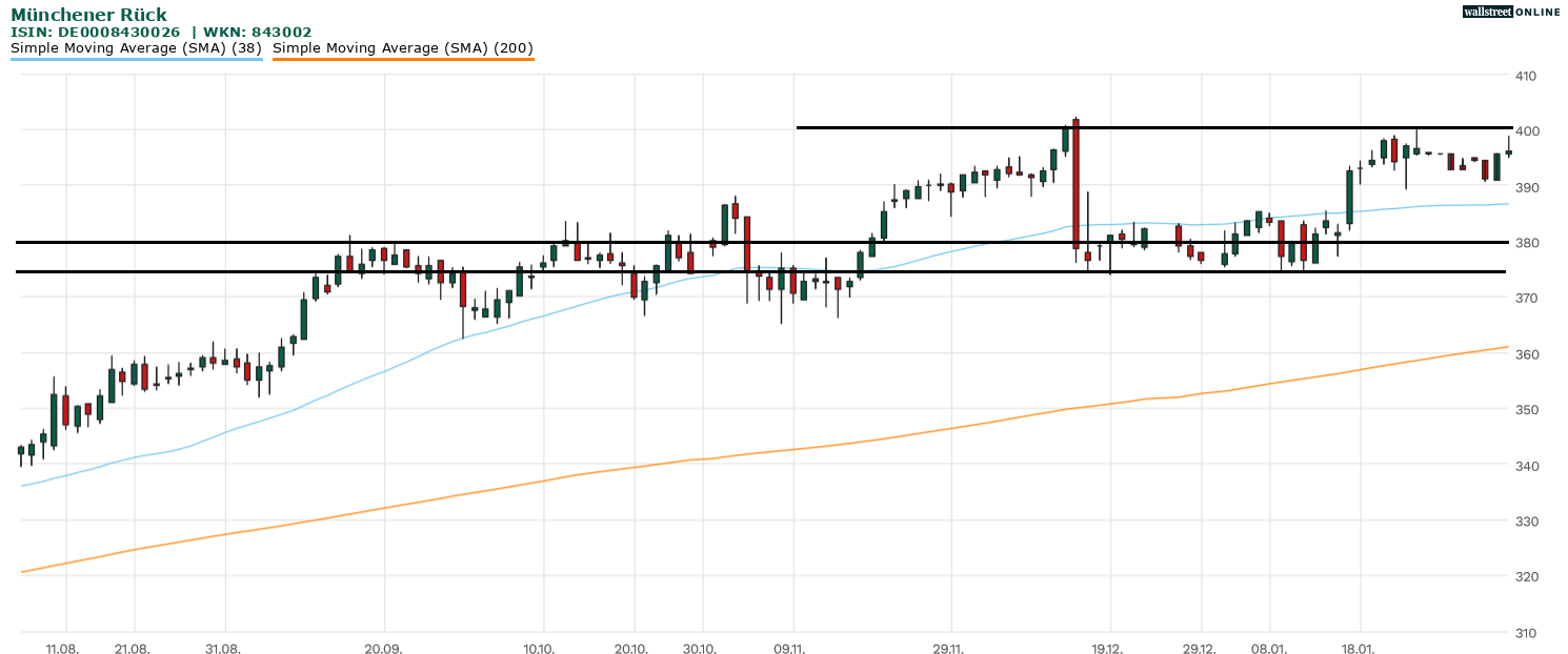 Die Aktie der Münchener Rück (Munich Re) (WKN: 843002 | ISIN: DE0008430026 | Ticker-Symbol: MUV2) arbeitet sich bereits seit geraumer Zeit an der Marke von 400 Euro ab.