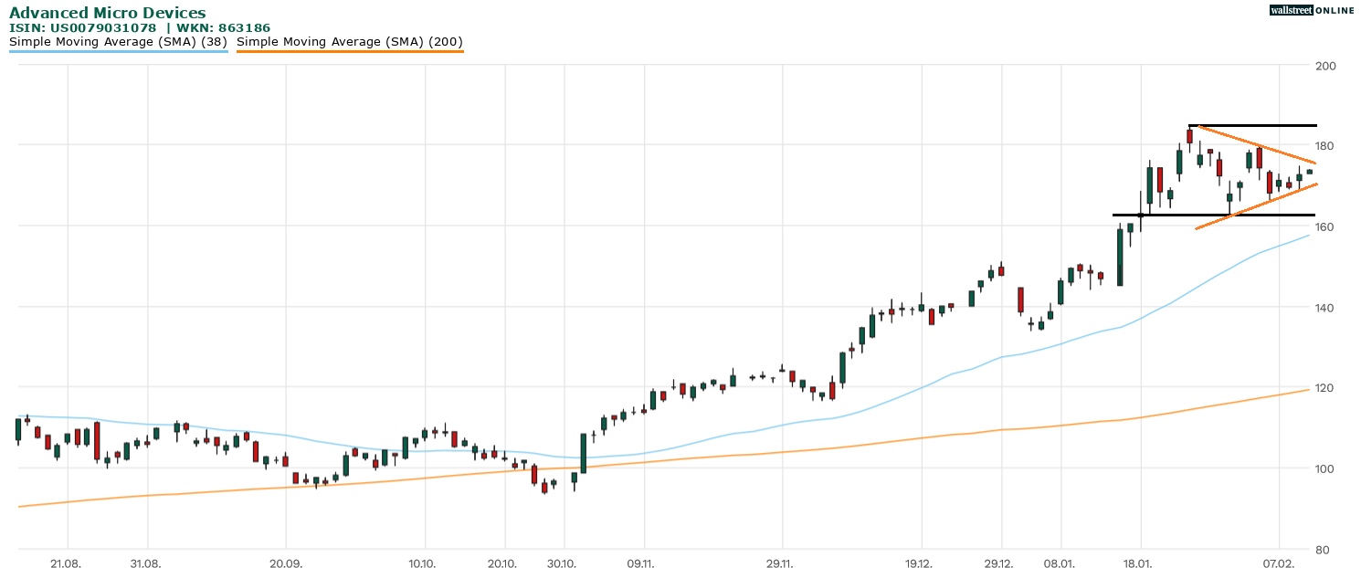 Vom kurz vor der Zahlenveröffentlichung erreichten Bewegungshoch bei 185 US-Dollar musste sich die AMD-Aktie zunächst verabschieden. Immerhin gelang es ihr, sich oberhalb von 160 US-Dollar zu stabilisieren. In den letzten Handelstagen bildete sich eine symmetrische Dreiecksformation (orange dargestellt) heraus, die aus charttechnischer Sicht jedoch für ein gewisses Unbehagen sorgt, handelt es sich hierbei doch um eine ambivalente Formation. Sollte es zu einem Ausbruch über die Oberseite des Dreiecks kommen, könnte noch einmal der Bereich von 185 US-Dollar in den Fokus geraten. Bei einem Ausbruch über die Unterseite könnte hingegen das letzte Verlaufstief bei 162+ US-Dollar noch einmal aktuell werden.