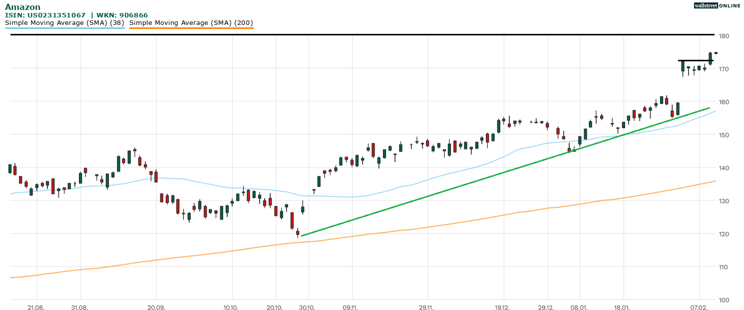 Für Amazon ging es nach den Zahlen über die 170 US-Dollar. Danach konsolidierte die Aktie, ohne jedoch Abwärtsmomentum zu entwickeln. Zuletzt setzte sich Amazon wieder in Bewegung. Eine Bewegung in Richtung 180 US-Dollar scheint angelaufen. Aus charttechnischer Sicht muss es jedoch das Ziel sein, die 188 US-Dollar zu überwinden. Hier liegt ein markantes Doppeltop, das sich im Jahr 2021 ausgebildet hatte.