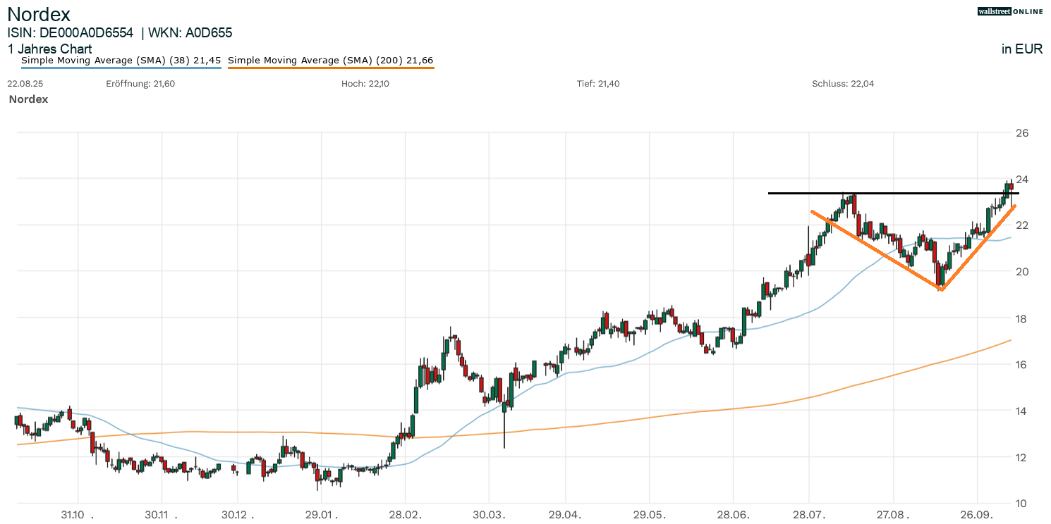 Der Markt honorierte die positive Nachrichtenlage. Die Aktie wurde gesucht. Der Ausbruch über die 23,3 Euro (August-Hoch) löste zudem ein frisches Kaufsignal aus. Gleichzeitig könnte sich dadurch eine V-Formation (orange dargestellt) vollenden. Anhand der Parameter der V-Formation ließe sich der Kursbereich 27 Euro / 28 Euro als potenzielles Bewegungsziel ableiten. Hierzu müsste sich das Kaufsignal allerdings final bestätigen. Insofern gilt aus bullischer Sicht: Jeder Tag, an dem die Nordex-Aktie oberhalb von 23,3 Euro notiert, ist ein guter Tag. Im besten Fall wird das Ausbruchsniveau nun nicht mehr deutlich unterschritten. Tritt dieser Fall dennoch ein, ist Obacht geboten, würde doch die Neutralisierung des Kaufsignals drohen. Das könnte wiederum weitere Abgaben provozieren.