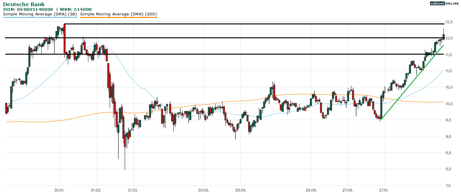 Der Ausbruch über die 12 Euro befeuerte noch einmal das Momentum in der Aktie. Das frische Kaufsignal trieb die Deutsche Bank bereits in die Reichweite zum 52-Wochen-Hoch bei 12,45 Euro. Damit ist aus charttechnischer Sicht die Aufgabenstellung für die kommenden Tage klar definiert: Die Deutsche Bank muss auf ein neues 52-Wochen-Hoch laufen, um sich weiteres Aufwärtspotential zu erschließen. Rücksetzer sollte hingegen auf den Bereich von 11,5 Euro begrenzt bleiben. Anderenfalls könnte es doch noch einmal eng für die Aktie werden.