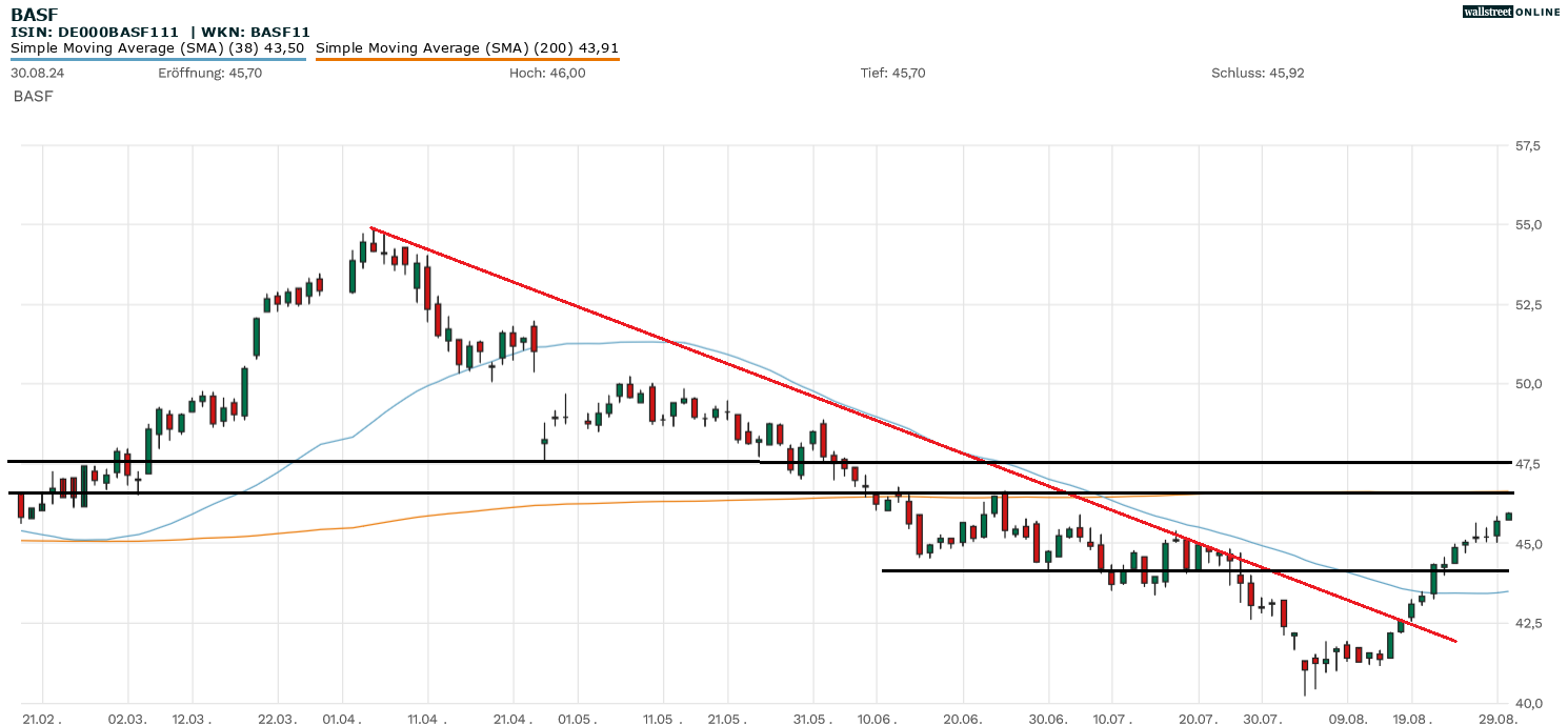 Der Rücksetzer in Richtung 40 Euro kann im Nachhinein als Marktbereinigung interpretiert werden. Das vermeintlich günstige Kursniveau lockte Käufer in die Aktie. BASF startete eine kräftige Erholung. Mit den Kursbereichen von 42,5 Euro und 44 Euro wurden wichtige Widerstände zurückerobert. Um den Bruch des Abwärtstrends abschließend zu bestätigen, bedarf es allerdings noch einer weiteren Kraftanstrengung. BASF muss über die 46,5 Euro und 47,5 Euro vorstoßen! Etwaige Rücksetzer bleiben in der aktuellen Situation idealerweise auf 44 Euro begrenzt.