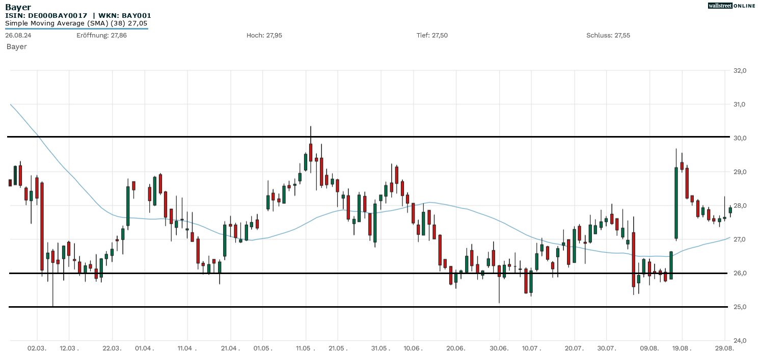 Doch Bayer scheiterte mit dem Versuch, über die 30 Euro vorzustoßen. Gewinnmitnahmen setzten ein. Mit dem Rücksetzer unter die Marke von 28 Euro musste die Aktie zunächst einen Rückschlag verkraften. Der robuste Gesamtmarkt könnte Bayer nun zu einem Comeback verhelfen. Die Aktie drehte zuletzt wieder nach oben ab. Eine Rückkehr über die 28 Euro würde der Aktie erneut die Tür in Richtung 30 Euro öffnen. Kurzum. Das Scheitern an der 30er Marke hat die Bayer-Aktie kurzzeitig aus dem Tritt gebracht. Aktuell bahnt sich ein neuer Versuch an. Mit einem Ausbruch über die 30 Euro würde die Bayer-Aktie gleichzeitig die seit Monaten dominierende Handelsspanne auflösen. Einen Rücksetzer unter den zentralen Unterstützungsbereich 26 Euro / 25 Euro gilt es hingegen, zu verhindern. Anderenfalls würde eine Neubewertung der Lage notwendig.