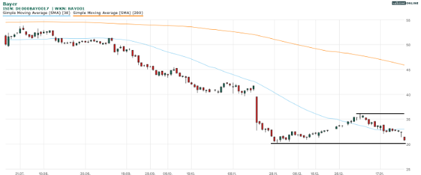 Unsere letzte Kommentierung zur Bayer-Aktie (WKN: BAY001 | ISIN: DE000BAY0017 | Ticker-Symbol: BAYN) überschrieben wir am 14. Januar mit „Aktie gerät nun doch ins Straucheln.“. Die Aktie markierte zuvor im Bereich von 36+ Euro ein Zwischenhoch, drehte aber danach nach unten ab.
