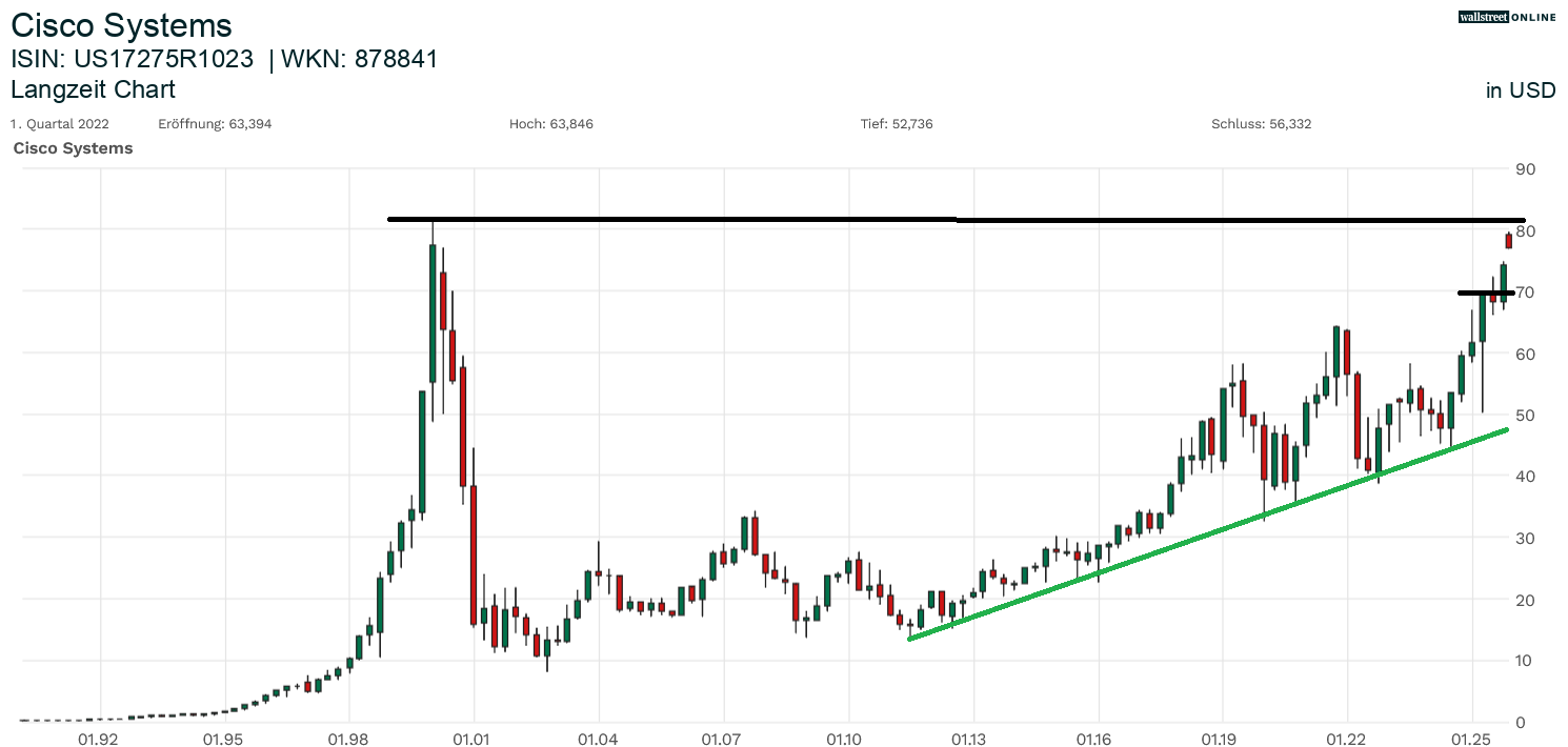 Der Markt honorierte die Daten. Die Aktie legte deutlich zu. Und der untere Chart belegt es - Cisco Systems ist drauf und dran, die Rekordhochs aus dem Jahr 2000 (!) zu überwinden. Eine Leidenszeit von 25 Jahren scheint ihrem Ende entgegenzugehen.