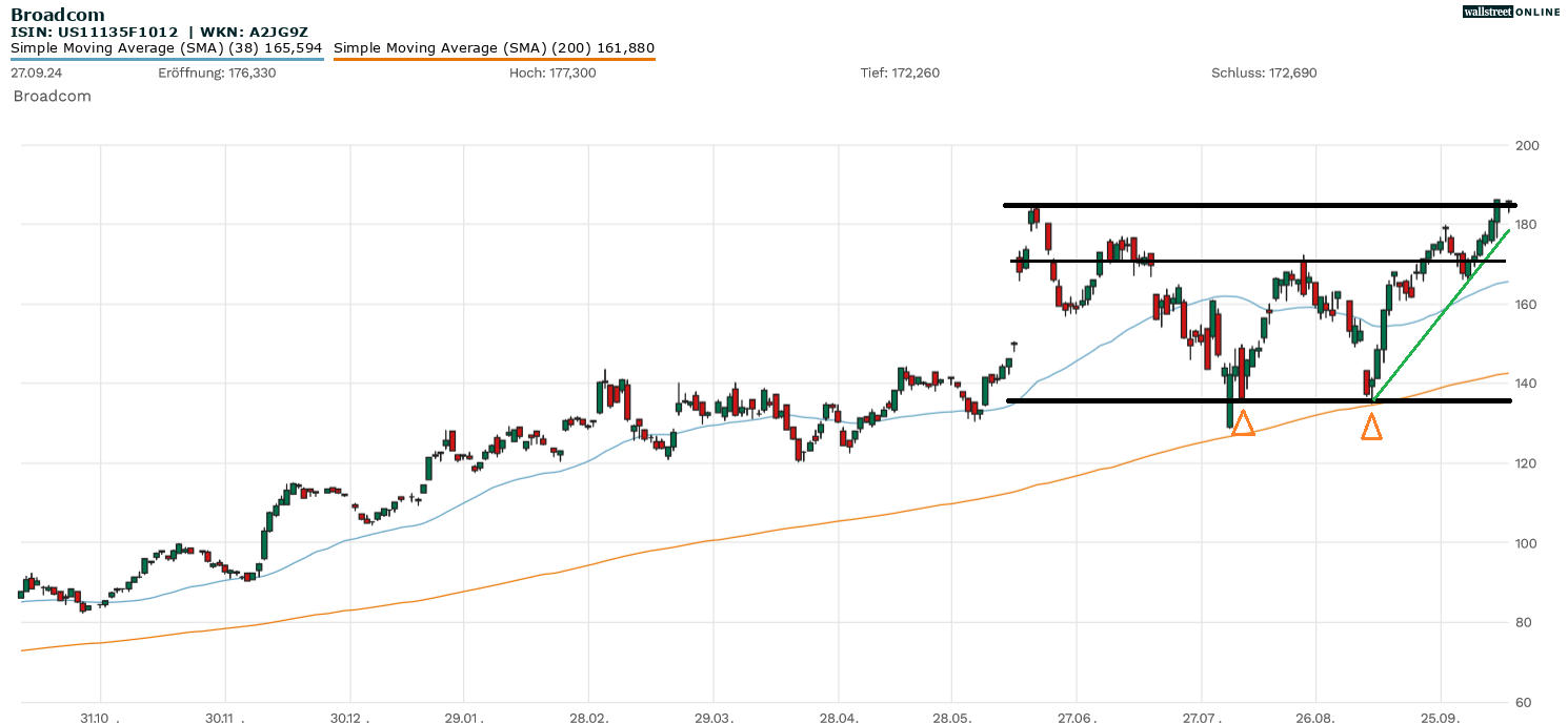 Broadcom initiierte zuletzt eine Erholung. Zahlreiche Faktoren sorgten dafür, dass die Erholung Fahrt aufnehmen konnte. Die Stimmung im Tech-Sektor hellte sich zwischenzeitlich aus. Und nicht zuletzt die Ende September veröffentlichten Zahlen von Mitbewerber Micron erwiesen sich als überaus kurstreibend für Broadcom und den ganzen Sektor. Im Ergebnis läuft die Aktie nun den Widerstandsbereich von 185 US-Dollar an.