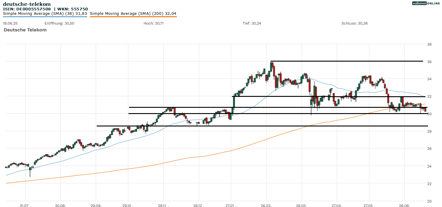 Für die Deutsche Telekom wird es nun aus charttechnischer Sicht eng. Einen Verlust der 30 Euro gilt es, zu vermeiden. Sollte es hierzu kommen, ist Obacht geboten. Um das Chartbild aufzuhellen, muss die Aktie über die Marke von 32 Euro zurückkehren.