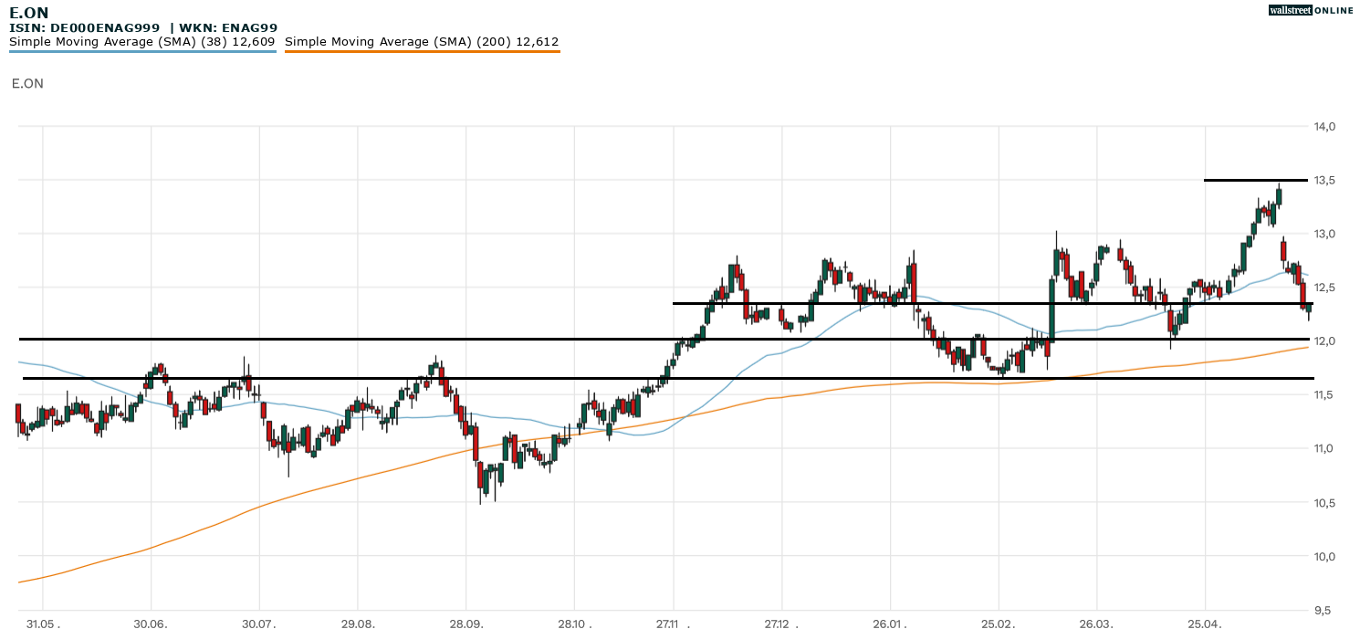 Vom markanten Verlaufshoch, das E.ON (WKN: ENAG99 | ISIN: DE000ENAG999 | Ticker-Symbol: EOAN) unlängst nahe der 13,5 Euro ausbildete, entfernte sich die Aktie bereits deutlich. Aktuell rückt die markante Unterstützung von 12,3 Euro in den Fokus.