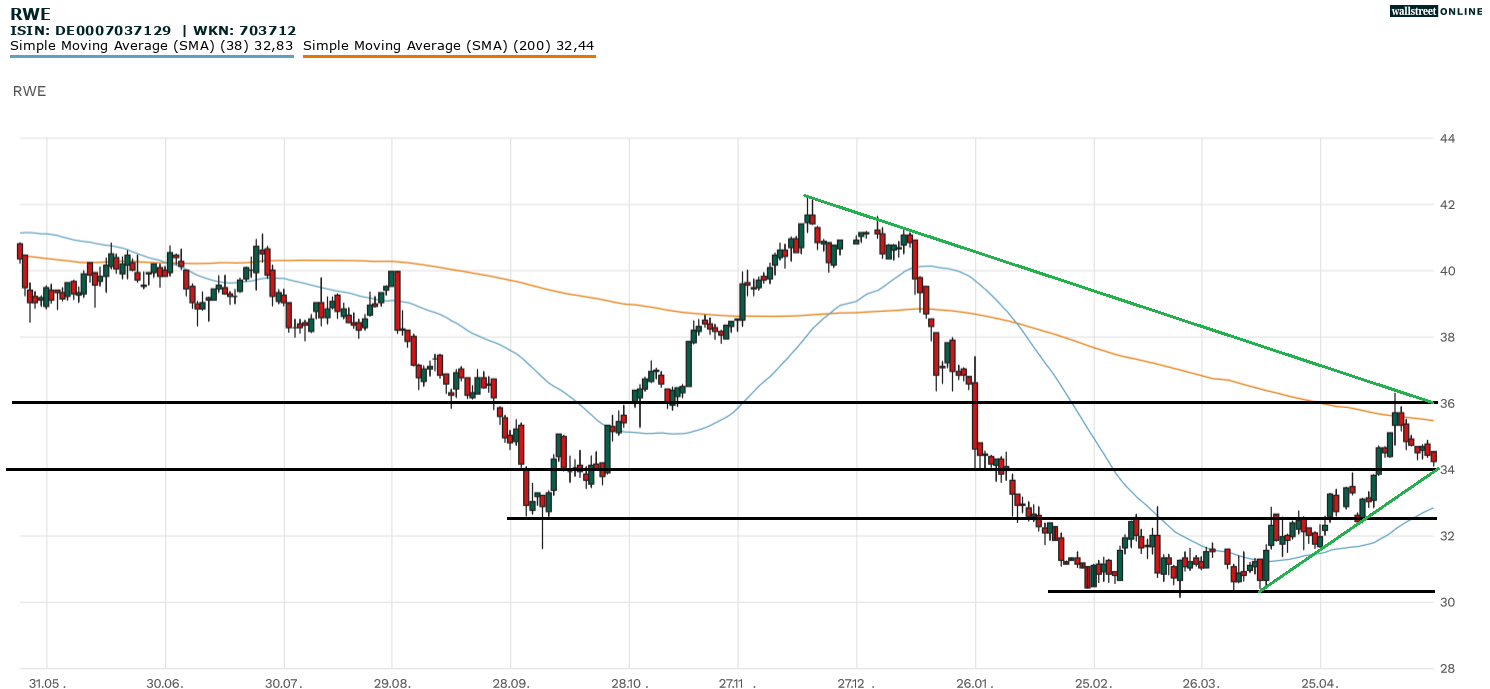 Die Aktie war gerade im Begriff, die wichtige Zone um 36 Euro zurückzuerobern und in diesem Zusammenhang auch die 200-Tage-Linie bullisch zu kreuzen, als die Gewinnmitnahmen einsetzten. Der Rücksetzer nähert sich bereits der wichtigen Unterstützung von 34 Euro. Doch auch eine Ausdehnung der Bewegung in Richtung 32,5 Euro ist aktuell nicht auszuschließen. Die zentrale Unterstützung ist unverändert in den Bereich von 30,4 Euro zu verorten. Mit Blick auf die Oberseite bleibt es dabei: Eine Bewegung über die 36 Euro / 37 Euro käme für die Aktie einem Befreiungsschlag gleich.