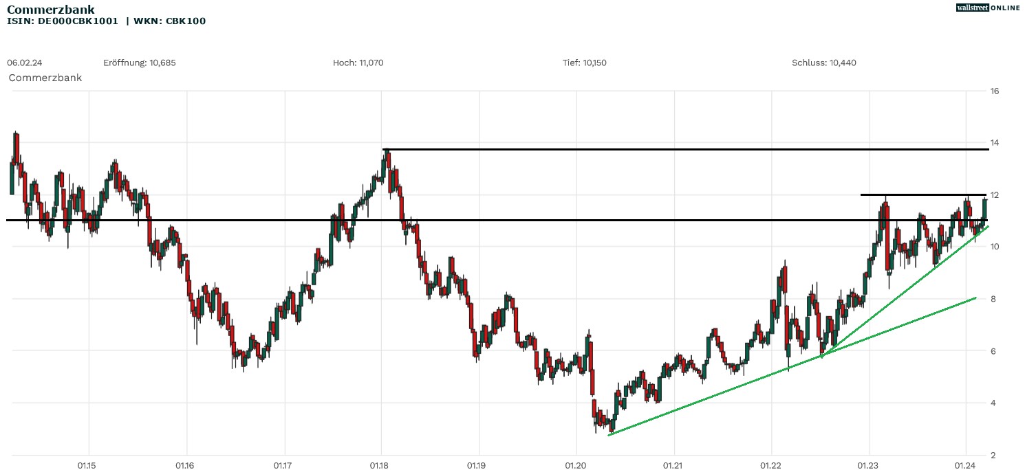 Die Commerzbank steht unmittelbar davor, die Tür in Richtung 13,8 Euro aufzustoßen. Doch Obacht. Aufgrund der überkauften Lage ist jederzeit mit Gewinnmitnahmen zu rechnen. Im besten Fall bleiben diese auf 11,5 Euro begrenzt. Ein Rücksetzer unter die 11 Euro wäre hingegen ein herber Rückschlag und würde eine Neubewertung notwendig machen.