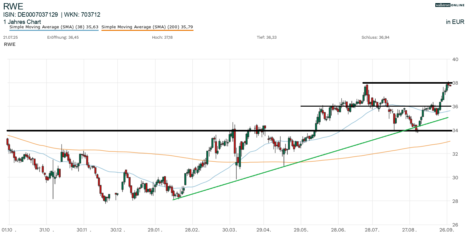 Von diesem Rückschlag erholte sich die Aktie jedoch vergleichsweise schnell. Die RWE-Aktie drehte nach oben ab und überwand im nächsten Anlauf die 36 Euro. Die Tür in Richtung Juli-Hoch nahe der Marke von 38 Euro öffnete sich. Zur Stunde setzt RWE diesen Widerstand unter Druck. Sollte der Ausbruch gelingen, dürfte einer Fortsetzung der Aufwärtsbewegung in Richtung 40 Euro und darüber hinausgehend nicht sonderlich viel im Wege stehen. Rücksetzer bleiben im besten Fall auf 36 Euro begrenzt. Die zentrale Unterstützung ist in den Bereich von 34 Euro zu verorten. Sollte es darunter gehen, würde eine Neubewertung der Lage notwendig werden.
