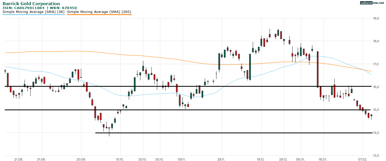 Zum Zeitpunkt unserer letzten Kommentierung (01. Februar) hatte Barrick Gold noch die Möglichkeit, die wichtigen Kursbereiche um 16 US-Dollar und 16,6 US-Dollar zurückzuerobern. In den letzten Handelstagen geriet die Aktie allerdings weiter in Bedrängnis. Die 15 US-Dollar wurden unterschritten. Und es könnte noch schlimmer kommen, denn die Aktie steuert auf die Zone 14,0 US-Dollar / 13,8+ US-Dollar zu. Die Ausbildung eines neuen 52-Wochen-Tiefs würde die Aktie aus charttechnischer Sicht weiter zurückwerfen. Sollte es darunter gehen, könnte es zu weitere Abgaben in Richtung 13 US-Dollar kommen. Die Rückkehr über die 15 US-Dollar würde zumindest ein wenig Entspannung mit sich bringen.