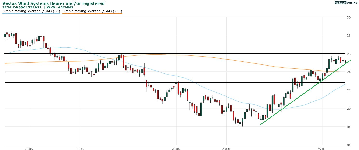 Unsere letzte Kommentierung zu Vestas  (WKN: A3CMNS | ISIN: DK0061539921 | Ticker-Symbol: VWSB) überschrieben wir am 04. Dezember mit „Vestas wieder obenauf.“. Nach dem erfolgreichen Ausbruch über die Widerstandsmarke von 24 Euro nahm die Aktie Kurs auf den Widerstand von 26 Euro.