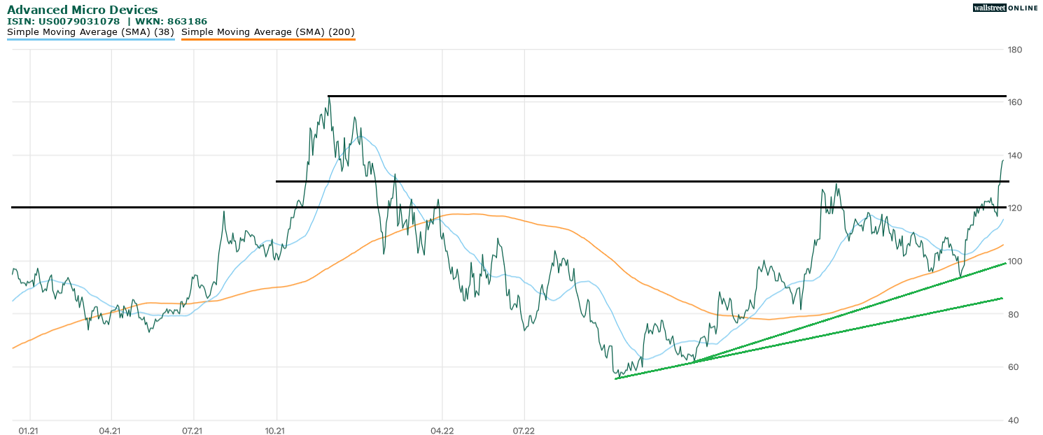 AMD hat den Kursturbo gezündet. Die Aktie pulverisierte den Widerstandsbereich 130 US-Dollar / 132+ US-Dollar und löste damit ein veritables Kaufsignal aus. Dieses entfaltet derzeit auf eindrucksvolle Art und Weise seine Wirkung. Aktuell nimmt AMD den untergeordneten Widerstandsbereich um 140 US-Dollar ins Visier. Ein erfolgreicher Ausbruch würde den Weg in Richtung des Hochs aus dem Jahr 2021, das damals bei 160+ US-Dollar markiert wurde, ebnen. Das Thema KI schlägt zunehmend auf AMD durch und treibt den Aktienkurs. AMD stand bislang bei diesem Thema immer etwas im Schatten von Nvidia, doch das scheint sich gerade zu ändern. Mit Gewinnmitnahmen ist ob des exponierten Kursniveaus allerdings jederzeit zu rechnen. Im besten Fall bleiben diese auf 130 US-Dollar begrenzt. Ein Rücksetzer unter die 120 US-Dollar müsste schließlich eine Neubewertung der Lage nach sich ziehen.