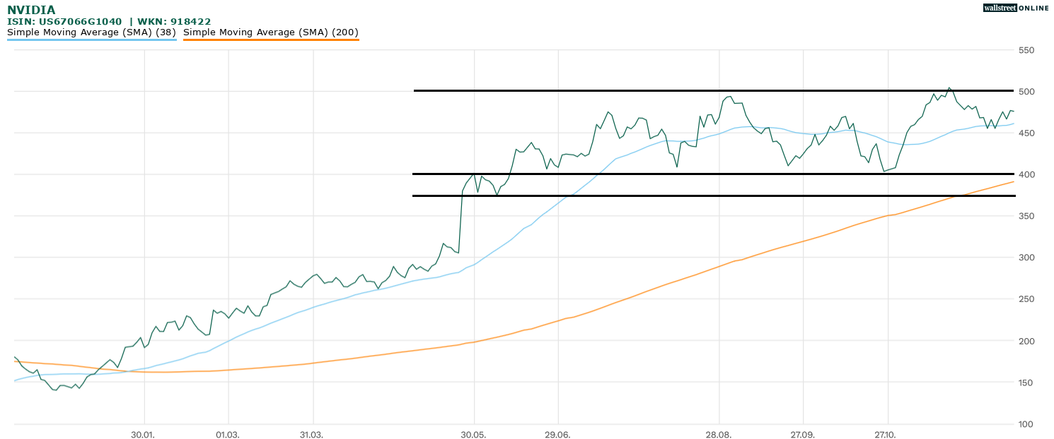 Mittlerweile zieht sich die Konsolidierung schon über Monate. Die Seitwärtsbewegung in den Grenzen 500 US-Dollar und 400 US-Dollar / 370 US-Dollar ist Ausdruck der aktuellen Hängepartie. Die aktuelle Konstellation ist nicht ohne Risiken für die Aktie, könnte das Ganze doch auch in einer großen Top-Bildung münden. Insofern sollte die Nvidia-Aktie Ausflüge unter die 400 US-Dollar / 370 US-Dollar tunlichst vermeiden. Anderenfalls könnte es bitter werden…