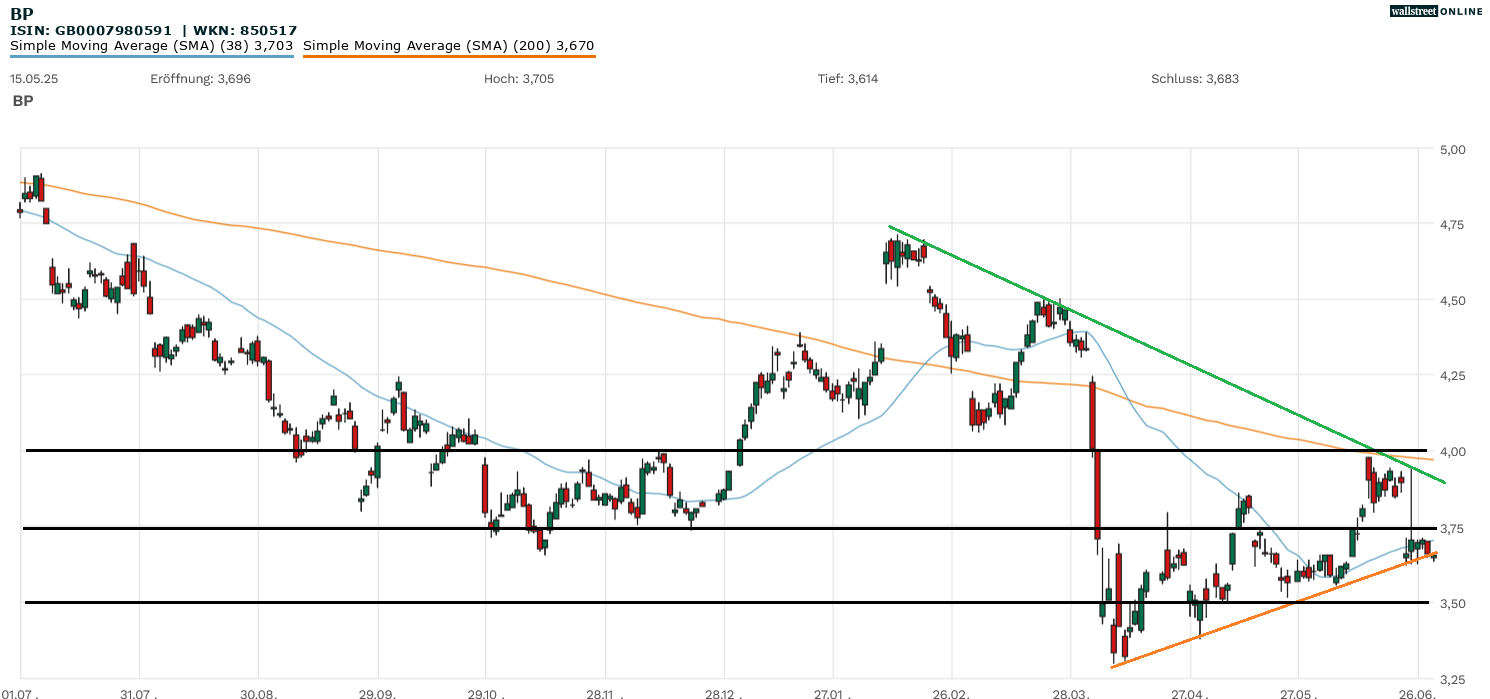 Die Aktie (WKN: 850517 | ISIN: GB0007980591 | Ticker-Symbol: BPE5) des britischen Ölproduzenten scheiterte trotz bester Ausgangslage mit dem Versuch, den markanten Widerstand von 4 GBP zu knacken. Der Abwärtstrend (grün dargestellt) setzte sich einmal mehr durch. Damit scheiterte die Aktie auch mit dem Versuch, die 200-Tage-Linie wieder zurückzuerobern. Der jüngste Rückgang der Ölpreise blieb auch für BP nicht folgenlos. Die Aktie wurde von Gewinnmitnahmen erfasst.
