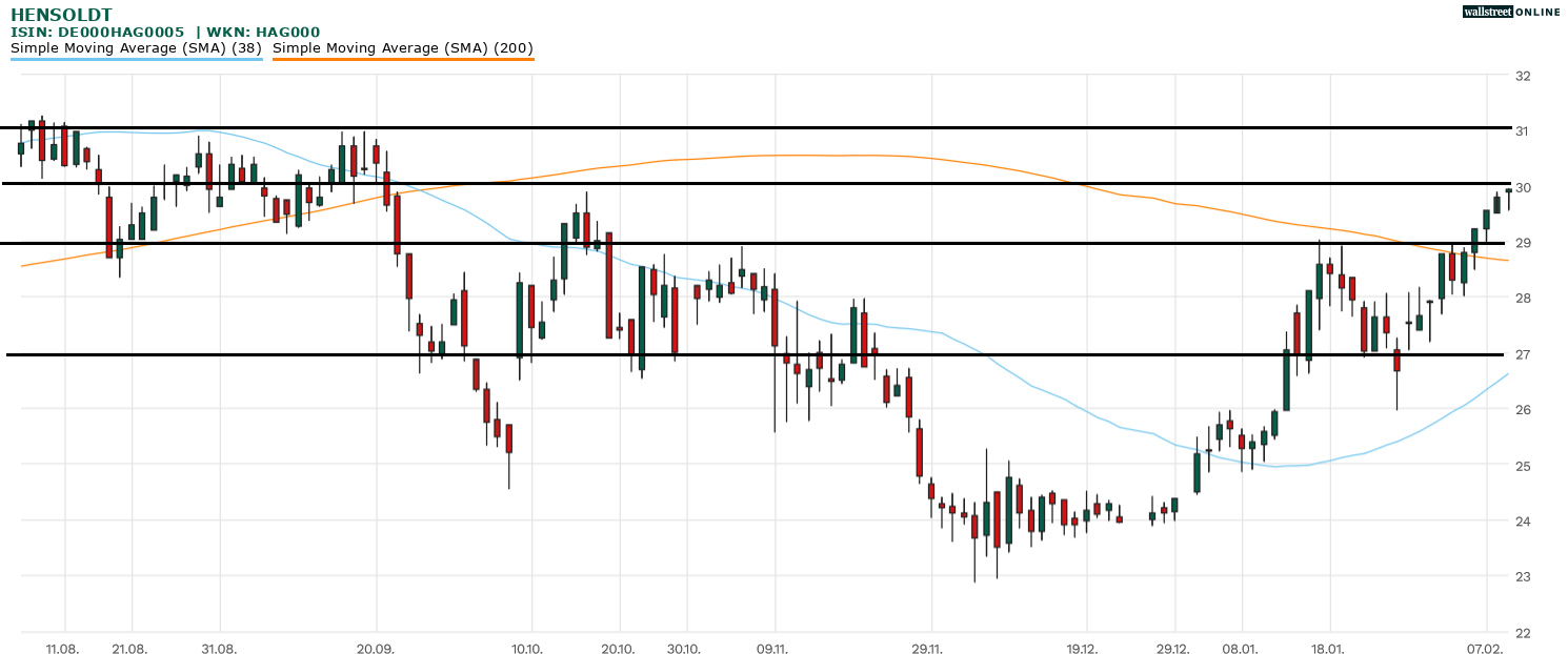 Hensoldt konnte in den letzten Wochen wichtige Weichenstellungen erzwingen. Vor allem die Ausbruchsbewegungen über die 27 Euro und 29 Euro sind hier hervorzuheben. Aktuell steht der Kursbereich von 30 Euro im Fokus. Knapp darüber – im Bereich von 31+ Euro – liegt dann bereits die nächste Herausforderung, sollte es Hensoldt gelingen, die 30 Euro zu knacken. Kurzum. Die Hensoldt-Aktie weist eine veritable Rally auf. Die nächsten Widerstände warten nun allerdings. Gelingt es der Aktie, das Momentum hochzuhalten und die Bewegung über die 30 Euro und 31 Euro zu führen? Die nächsten Handelstage werden die Entscheidung bringen. Aufgrund des fortgeschrittenen Stadiums der Bewegung ist jedoch jederzeit mit Gewinnmitnahmen zu rechnen. Etwaige Rücksetzer sollten im besten Fall auf 29 Euro begrenzt bleiben. Ein Rücksetzer unter die 27 Euro wäre hingegen ein herber Rückschlag.