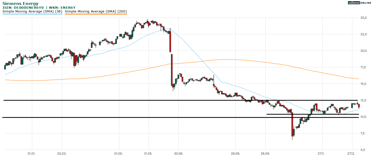 Die zuletzt zu beobachtende Bodenbildung verlief durchaus vielversprechend, doch erst ein Ausbruch über den Widerstandsbereich von 12,5 Euro würde die Bodenbildung entscheidend voranbringen. Die Ausgangsposition war nicht die schlechteste. Siemens Energy arbeitete sich zuletzt an die 12,5 Euro heran und setzte diesen markanten Widerstand unter Druck. Es hätte noch eines kleinen Vorstoßes bedurft, um den Widerstand zu knacken, doch Gewinnmitnahmen setzten ein und vereitelten den Versuch.