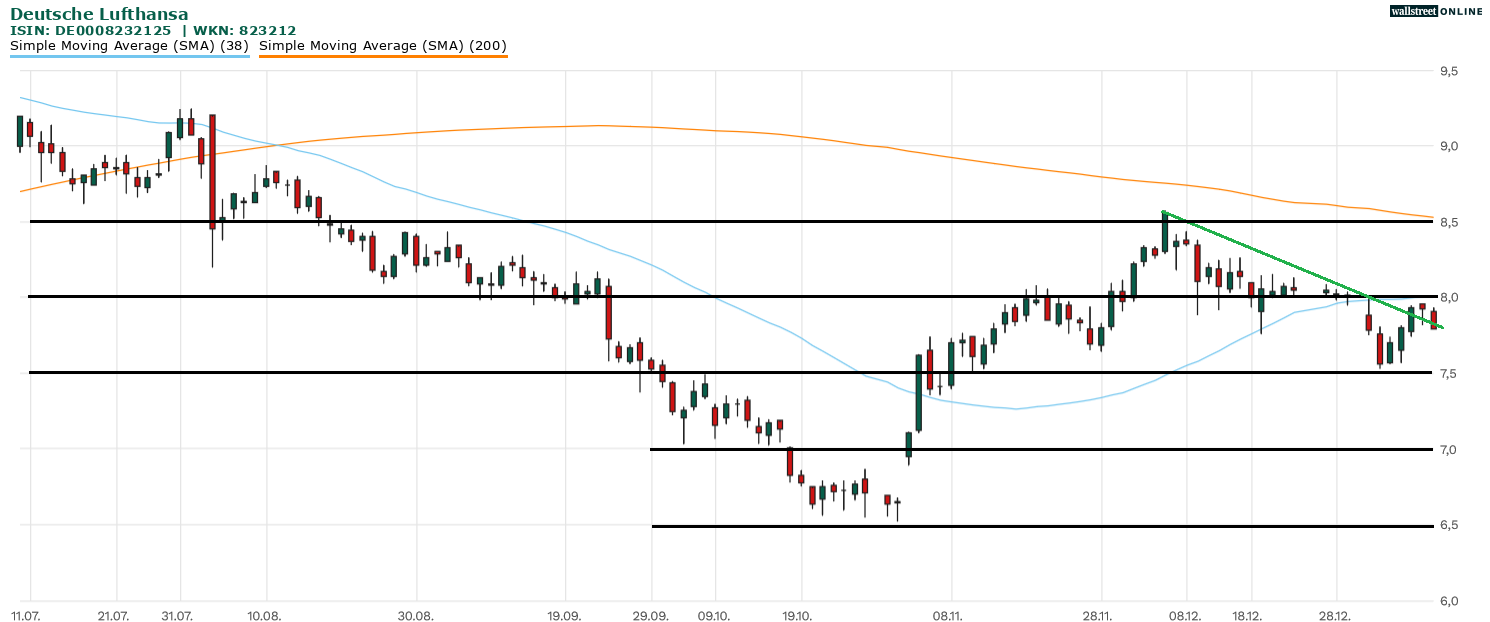 Die Aktie der Deutschen Lufthansa (WKN: 823212 | ISIN: DE0008232125 | Ticker-Symbol: LHA) tauchte gleich zu Jahresbeginn unter die wichtige Unterstützung von 8 Euro ab.