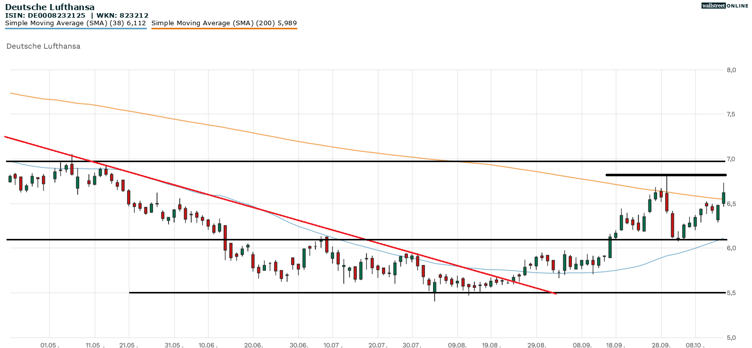 Der untere Chart der Aktie der Deutschen Lufthansa (WKN: 823212 | ISIN: DE0008232125 | Ticker-Symbol: LHA) verdeutlicht die schwierige Lage auf eindrucksvolle Art und Weise. In den letzten Monaten schwächelte die Aktie; von gelegentlichen Erholungsversuchen einmal abgesehen. Im Ergebnis erlangte ein veritabler Abwärtstrend Bedeutung. Erst Ende August gelang es der Deutschen Lufthansa, den Würgegriff des Abwärtstrends (rot dargestellt) zu lösen und eine untere Trendwende einzuleiten.