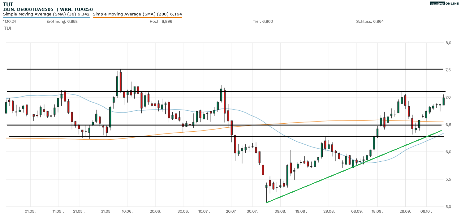 Auch für die Aktie des Reise- und Tourismuskonzerns TUI (WKN: TUAG50 | ISIN: DE000TUAG505 | Ticker-Symbol: TUI1) gilt es nun, die gute Ausgangslage zu nutzen. Nach dem knackigen Rücksetzer unter die 6,5 Euro ist die Aktie zurück und setzt bereits den markanten Widerstandsbereich um 7+ Euro unter Druck.