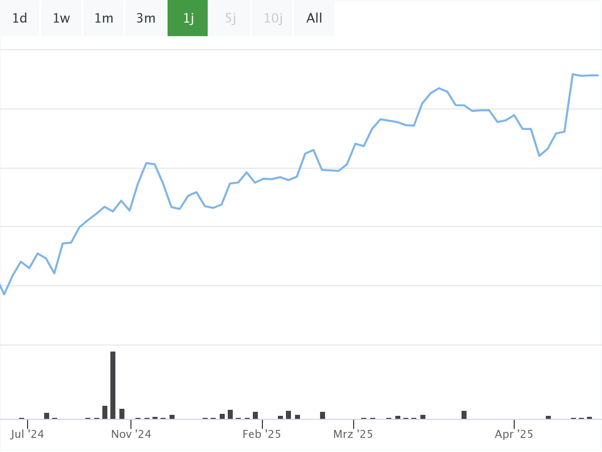 Seit seiner Auflage am 31. März 2023 hat sich der ETF beachtlich entwickelt. Innerhalb von nur zwölf Monaten stieg der Kurs um 54,23 % auf 42,05 EUR pro Anteil (Stand: 19. April 2025). Selbst der kurzfristige Einbruch durch den sogenannten Trump-Zoll-Schock konnte dem langfristigen Aufwärtstrend wenig anhaben – der ETF notiert aktuell wieder leicht im Plus.