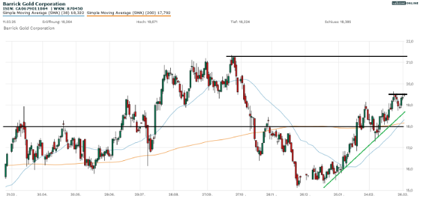 Barrick Gold bekommt derzeit Unterstützung von haussierenden Gold- und Kupferpreisen. Die Aktie selbst hängt noch am Widerstandsbereich von 19,5 US-Dollar fest. Sollte die Aktie diesen Widerstand knacken, könnte es rasch auf 21,2 US-Dollar gehen. Etwaige Rücksetzer bleiben idealerweise auf 18 US-Dollar begrenzt.