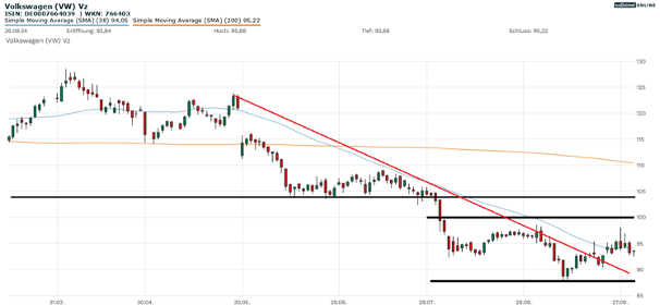 Die Volkswagen Vz. haben den kurzfristigen, steil verlaufenden Abwärtstrend (rot dargestellt) zwar seitlich verlassen können, doch so wirklich überzeugend ist das Ganze bislang nicht. Um die Bodenbildung entscheidend voranzubringen, bedarf es eines nachhaltigen Vorstoßes über die 100 Euro, noch besser über die 104 Euro. Auf der Unterseite droht weiteres Ungemach, sobald die Aktie das bisherige Tief von 88 Euro noch einmal unterschreiten sollte.