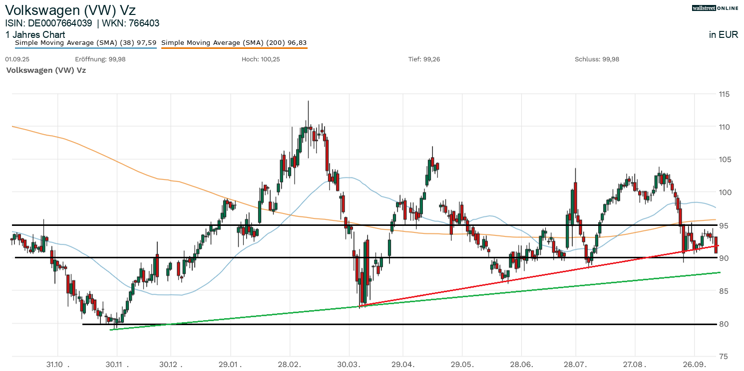 Der Autosektor leidet unter der Nachrichtenlage. Die Volkswagen Vz. können sich der Situation nicht entziehen und stehen unter Druck. Ein Rücksetzer unter die 90 Euro würde das Chartbild erheblich eintrüben und weitere Abgaben provozieren. Ein Sprung über die 95 Euro würde hingegen die charttechnische Lage zumindest etwas stabilisieren.