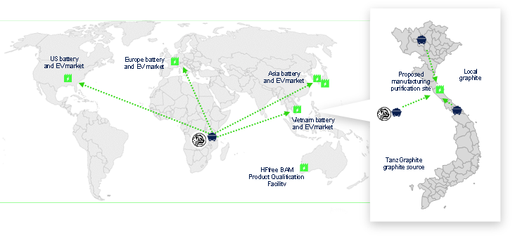 Abbildung 1: Tansanisches Graphit von Ecograf’s Epanko Projekt könnte Anlagen für Batterieanoden auf der ganzen Welt beliefern – in Vietnam, Korea, Japan, Europa und den USA.