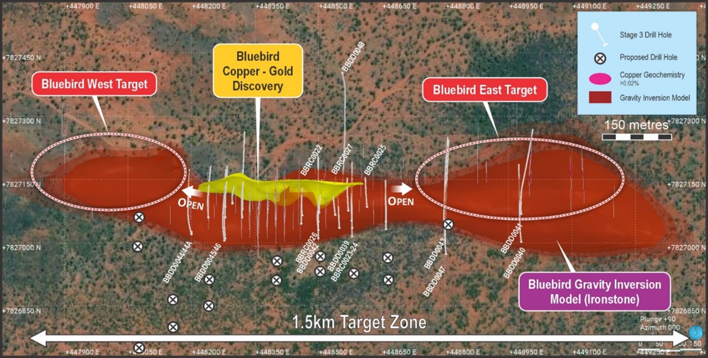 Die Ergebnisse von fünf Bohrlöchern, die entlang des Streichens innerhalb der 1,5 km langen Gravitations-Eisenstein-Zielzone (siehe Abbildung 3) auf Wiederholungen von Bluebird getestet wurden, stehen noch aus. Zwei dieser Bohrlöcher durchschnitten eine sichtbare Kupfermineralisierung auf dem Ziel Bluebird East durchschnitten eine 61 m lange Zone mit Hämatit-Alteration, einschließlich 14 m starker Hämatit-Alteration mit sichtbarer Kupfermineralisierung (Chalkopyrit und geringfügiges Chalkosin) in BBDD0048, und, eine 24 m lange Zone mit starker Hämatit-Alteration und 8 m Kupfermineralisierung in BBDD0043. Die neuen Ergebnisse stammen aus dem jüngsten erfolgreichen Erweiterungsbohrprogramm bei Bluebird, das bis dato 17 Bohrlöcher mit einer Gesamtlänge von 3.886 m.