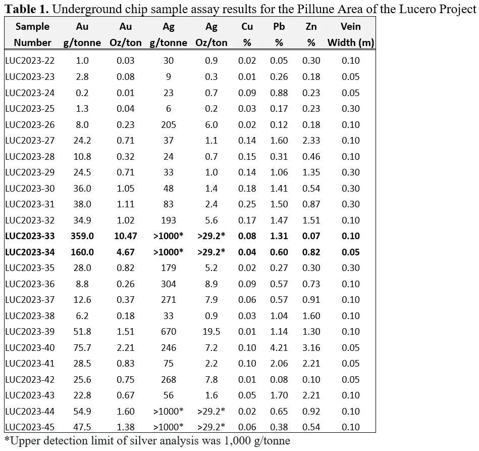 Element79-CEO James Tworek erklärte: „Dieser Schwung von 24 Untersuchungsergebnissen aus dem Untertage-Probenahmeprogramm 2023, das vom Auftragnehmer SLM Resource Group im Pillune-Gebiet des Lucero-Projekts durchgeführt wurde, ergab eine beeindruckend hochgradige Gold- und Silbermineralisierung mit bis zu 10,5 Unzen pro Tonne Gold und >29 Unzen pro Tonne Silber sowie einige großartige Buntmetallergebnisse. Dies ist für uns sehr ermutigend, da es das Potenzial für einen bedeutenden hochgradigen zukünftigen Betrieb weiter bestätigt.“