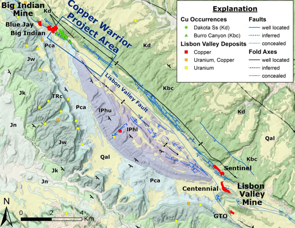 Die Kupfermineralisierung in der Lisbon Valley-Mine nämlich befindet sich sowohl in sogenanntem Dakota- als auch im Lower Burro Canyon-Sandstein, wobei die Mineralisierung in der Lower Burro Canyon-Einheit etwa 80 % der Reserven und der geologischen Ressource ausmacht (40,4 Mio. Tonnen mit 0,46% Kupfer für über 180.000 Tonnen Kupfer). Alle Ressourcen von Big Indian befanden sich in der Einheit Lower Burro Canyon. Die Kupfermineralisierung auf Copper Warrior besteht aus verstreutem Chalkosin in den Sandsteineinheiten sowie aus Chalkosin, Azurit und Malachit, wo die Mineralisierung zu Tage tritt. Eine aderartige und höhergradige Mineralisierung ist im Projektgebiet in der Nähe der Lisbon Valley Fault, der Hauptquelle der kupferhaltigen Flüssigkeiten, weit verbreitet.