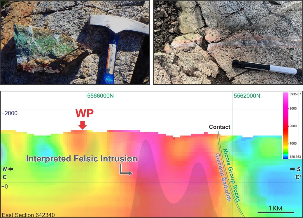 Abbildung 4. Querschnitt durch WP, der die ZTEM-Widerstandsanomalie zeigt, die möglicherweise eine felsische Intrusion darstellt. Die Fotos über dem Querschnitt zeigen Malachit (kupferhaltiges grünes Mineral) auf der linken Seite und eine Quarzader mit einem Halo aus Kalifeldspat (K) auf der rechten Seite.