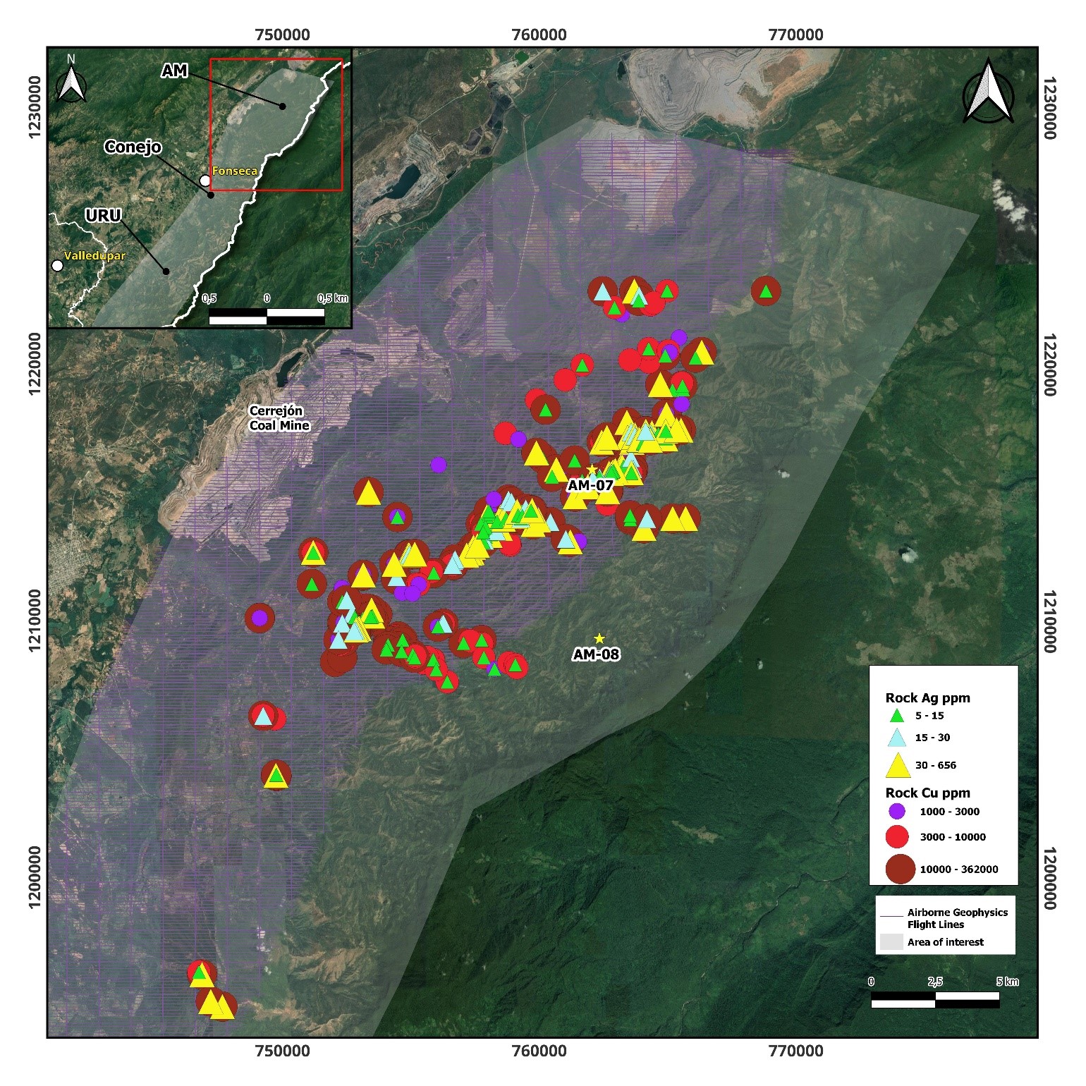 Vorläufige Arbeiten am AM 08-Aufschluss wiederum haben dem Unternehmen zufolge gezeigt, dass die Kupfer- und Silbervererzung in einer stark abfallenden Struktur in einem porphyrischen Rhyolith, einer Art felsischem Vulkangestein, enthalten ist, die auf einer Breite von 10 Metern sichtbar ist, bevor sie unter der Erdoberfläche verschwindet. Chalkosin und Malachit sind die häufigsten Kupferminerale, die im Aufschluss beobachtet wurden, wobei auch geringe Mengen an Chalkopyrit und Covellit auftreten.