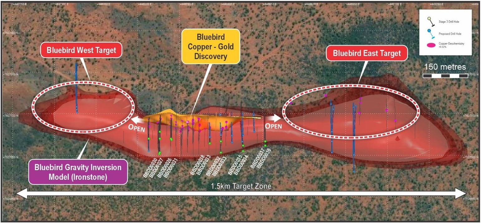 Frühere, stark kupferanomale oberflächliche RAB-Bohrungen auf Bluebird East sind 500 Meter östlich des derzeit identifizierten Fußabdrucks der Bluebird-Entdeckung zentriert. Das Ziel Bluebird East steht in Zusammenhang mit einer kürzlich modellierten IP-/Niedrigwiderstandsanomalie und einer mächtigen und durchgehenden Schwerkraft-„Eisenstein“-Anomalie. Eine ähnliche IP-Anomalie mit niedrigem Widerstand und hoher Schwerkraft befindet sich auf Bluebird West, 500 Meter westlich von Bluebird. Dort wurden allerdings noch keine Bohrungen durchgeführt.