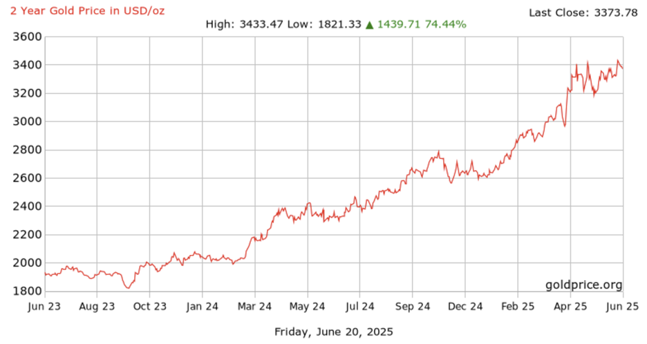 Gold – der ultimative Schutz in Krisenzeiten – ist von rund 1.800 USD/oz auf 3.350–3.450 USD/oz gestiegen und markiert neue Allzeithochs. Analysten von Goldman Sachs bis JP Morgan erwarten bis Ende 2025 Kurse von über 3.700 USD/oz – angetrieben durch massive Zentralbankkäufe, anhaltende Inflation und geopolitische Unsicherheit, insbesondere durch den Iran-Israel-Konflikt.