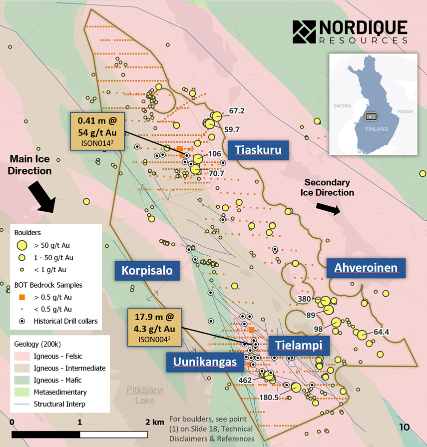 Fünf vorrangige Zielzonen – Korpisalo, Uunikangas, Tiaskuru, Ahveroinen, Tielampi – liegen entlang einer 6,7 km langen Kontaktzone an der Reisjärvi-Scherzone, einem bekannten strukturellen Ziel für orogenes Gold.