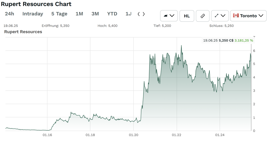 Ein aktuelles Beispiel: West Red Lake Gold Mines. Unsere Coverage startete bei 0,50 CAD – im Juni, nach der Wiederaufnahme der Produktion in der Madsen-Mine, stieg der Kurs auf 0,98 CAD, aktuell liegt er bei rund 0,80 CAD. Kein Zufall – sondern das klassische Re-Rating nach Kapitalzufluss, Produktionsmeldung und steigendem Goldpreis.