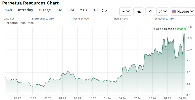 Ein Blick auf Perpetua Resources zeigt, wohin die Reise gehen könnte. Das Unternehmen ist ebenfalls im Antimonsegment aktiv und handelt inzwischen am NASDAQ. Die Aktie stieg von 1,69 USD auf 13,80 USD – ein Anstieg von über 700 %, ausgelöst durch denselben Megatrend: nationale Sicherheit trifft kritische Mineralien.