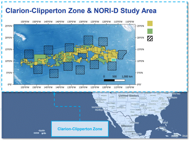 - Zielregion für Mineralrechte: Ein Teil der Clarion-Clipperton-Zone, die schätzungsweise 21 Milliarden trockene Tonnen polymetallischer Knollen enthält, einschließlich Nickel, Kobalt und Mangan[5]