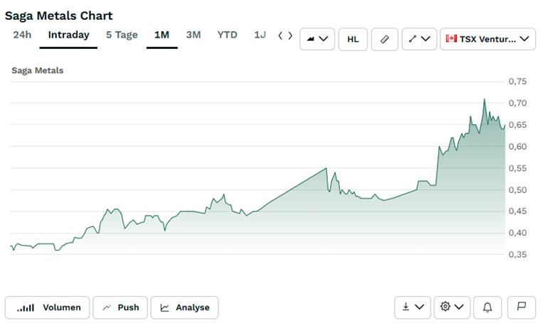 So sieht ein echter Ausbruch aus. Am 10. Dezember notierte Saga Metals still und leise bei rund 0,36 CAD. Heute – nur vier Wochen später – erreichte die Aktie intraday 0,72 CAD.