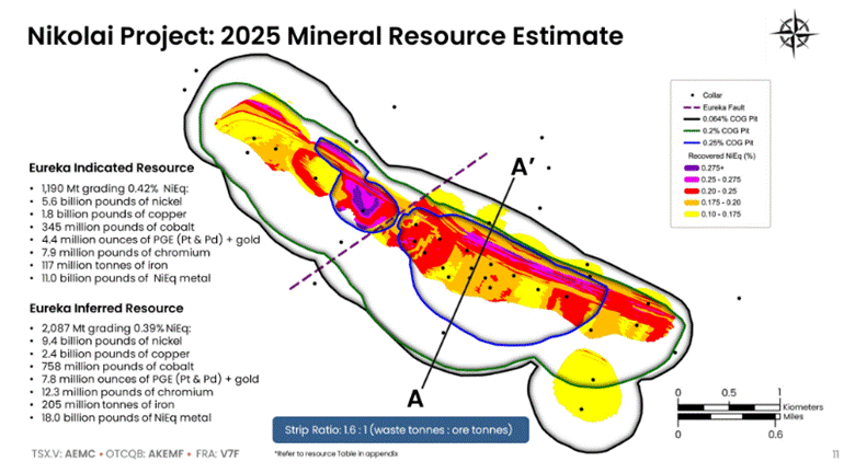 - Größte Nickel-Lagerstätte der USA: Das Nikolai-Projekt beherbergt eine NI-43-101-konforme Ressource mit 5,6 Mrd. Pfund angezeigtem Nickel und 9,4 Mrd. Pfund abgeleitetem Nickel – ein strategischer Vermögenswert von Weltklasse.