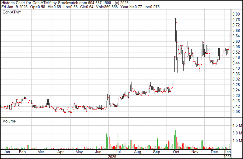 Parallel zu den Bohrergebnissen schloss ATMY ein strategisches Finanzierungsangebot über 9,5 Mio. CAD ab – beteiligt waren institutionelle Investoren aus New York (Wall Street) und Toronto (Bay Street).