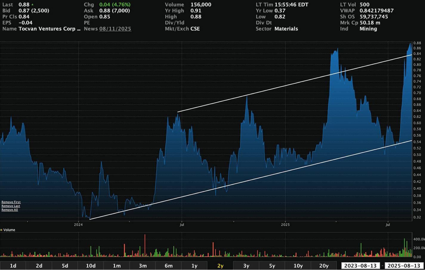 Rockstone Disclaimer: Dieser Artikel dient ausschließlich Informations- und Bildungszwecken und stellt keine Anlageberatung, Kauf- oder Verkaufsempfehlung dar. Alle dargestellten Einschätzungen, Prognosen oder Meinungen spiegeln den Stand zum Zeitpunkt der Veröffentlichung wider und können sich ohne Vorankündigung ändern. Es besteht keine Garantie, dass sich die erwähnten Aktien, Märkte, Rohstoffe oder wirtschaftlichen oder politischen Entwicklungen wie beschrieben entwickeln werden. Investitionen in Rohstoffe und v.a. in Aktien sind mit erheblichen Risiken verbunden, und es kann zu erheblichen Abweichungen von den hier dargestellten Szenarien kommen. Leser sollten sich vor finanziellen Entscheidungen unabhängig informieren oder professionellen Rat einholen. Beim Text handelt es sich u.a. um zitierte Teile der heutigen Pressemitteilung von Tocvan Ventures Corp. Bitte lesen Sie den vollständigen Disclaimer im vollständigen Research Report als PDF (hier), da fundamentale Risiken und Interessenkonflikte vorherrschen. Der Autor, Stephan Bogner, hält Aktien von Tocvan Ventures Corp., sodass er von Handelsvolumen- und Kurssteigerungen profitieren wird, wobei er für die hiesigen Ausführungen und Verbreitung auch bezahlt wird. Obwohl der Autor nicht direkt vom Unternehmen beauftragt und bezahlt wird, so findet eine Bezahlung von Dritten statt, wobei diese Dritten ebenfalls Aktien von Tocvan halten und von Handelsvolumen- und Kursanstiegen profitieren, sodass insgesamt mehrere Interessenkonflikte vorherrschen. Die hiesigen Ausführungen sollten somit nicht als Kaufempfehlung oder sonst wie als Handlungsempfehlung gewertet werden, sondern als Werbung. Einstige Profite sind keine Garantie für zukünftige Profite. Es wird empfohlen, dass Sie sich bei Investitionen immer der Hilfe von ausgebildeten und rechtlich eingetragenen Finanzberatern bedienen oder sich entsprechend Ihrem persönlichen Finanzhintergrund individuell beraten lassen. Vor einer Investition ist es empfehlenswert, genau festzulegen, welche Finanzziele Sie verfolgen, diese dann nach Relevanz einzuordnen, um dann festzustellen, welches Risiko Sie bereit sind, einzugehen, sodass alsdann ein vollständiger Finanzplan von einem anerkannten Finanzberater erstellt werden kann. Bitte holen Sie sich vor einer Investition zwingend einen solchen Finanzberater zur Seite und lesen Sie den vollständigen Disclaimer auf der Webseite von Rockstone Research.