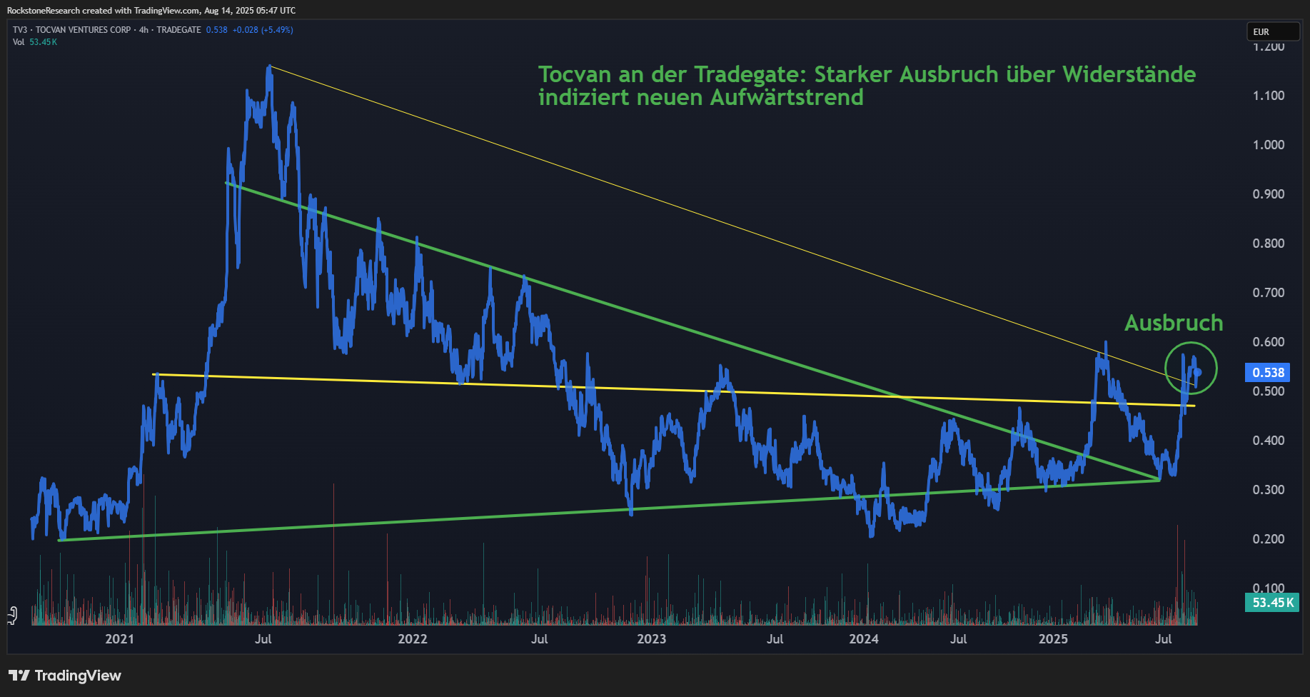 Vollbild / Tocvan an der deutschen Tradegate-Börse: Deutlicher Ausbruch über langfristige Widerstände signalisiert Beginn eines neuen Aufwärtstrends.