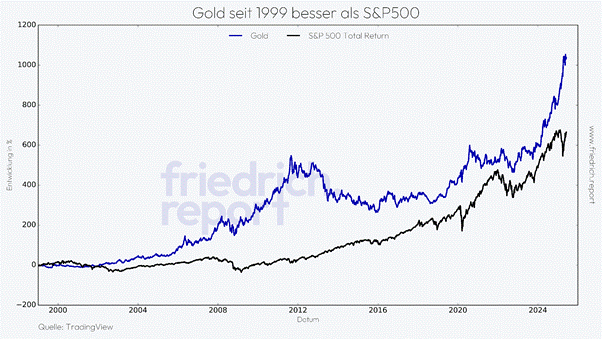 Seit Jahren häufen Zentralbanken weltweit Goldreserven an wie seit Jahrzehnten nicht mehr. China, Indien, Russland, die Türkei, selbst Polen und Ungarn – sie alle bauen ihre Bestände massiv aus. Und sie tun das aus einem Grund: Sie bereiten sich auf das Ende des westlichen Fiatgeldsystems vor. Auf ein neues, multipolares Währungsregime. Auf eine Welt nach dem Dollar. Betrachtet man sich die Performance von Gold im Vergleich zum S&P 500, ist klar zu erkennen, dass das gelbe Metall den Aktienmarkt seit der Jahrtausendwende deutlich outperformen konnte.