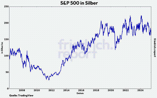 Anhand des folgenden Charts wird gut ersichtlich, dass Silber derzeit in Relation zum traditionellen Aktienmarkt unterbewertet ist und sich am unteren Ende der derzeitigen Range befindet.