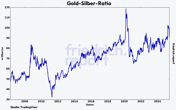 Historisch betrachtet war es dabei immer ein guter Kaufzeitpunkt, Silber am Hochpunkt der Gold-Silber-Ratio zu kaufen. Ein derzeitiger Wert von 100 war bisher lediglich im Jahr 2020 vorhanden, was den Kaufzeitpunkt verdeutlicht.